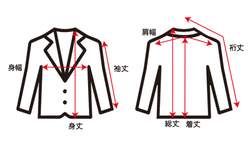 背面の襟下縫い目すぐ下から裾までを測ります。ベント(裾の切れ込み)がある場合は生地を整えて中心線に沿って測定するのがポイントです。ジャケットの着丈はヒップが隠れるかどうか、あるいは短めで動きやすい印象かなど、意図する見た目に合わせた選び方が重要です。