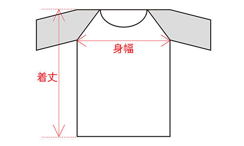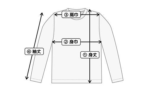 ・①身丈:首の付け根にあたるサイドネックポイントを起点に、裾までを測った長さ・②身巾:胴体部分の横幅を示す寸法で、左右の脇の少し下の位置(脇下)から脇下までを測った長さ