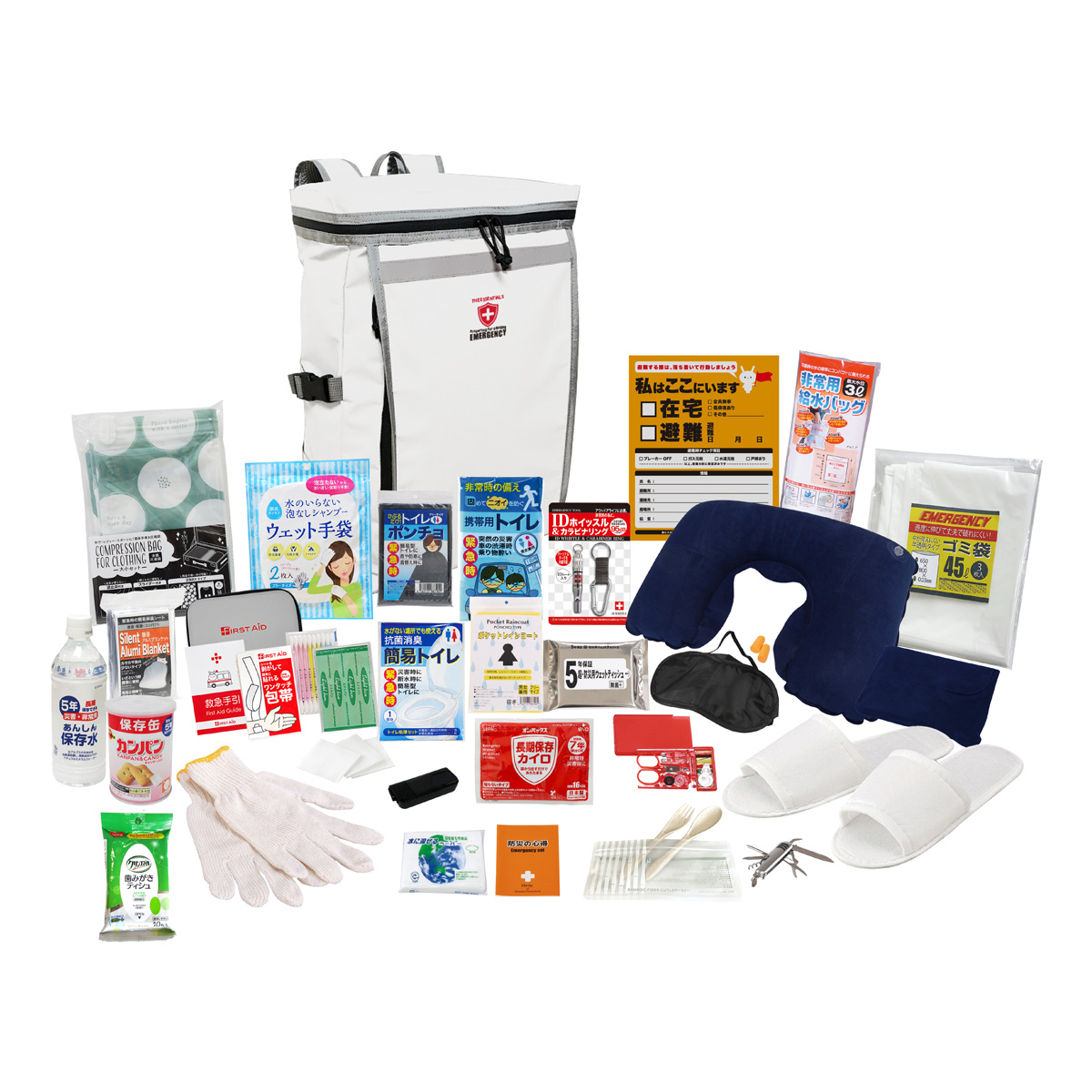 備考:収納リュック・防災の心得・IDホイッスル&カラビナリング・カイロ・レインコート・携帯用トイレ・抗菌消臭簡易トイレ・トイレポンチョ・ダイナモマルチライト・モバイルバッテリー(乾電池式)・軍手・静音アルミブランケット・ウェットティッシュ・衣類圧縮袋・スリッパ・ネックピロー・アイマスク・耳栓・5年保存水500ml・カンパン・カトラリーセット・8徳ナイフ・給水袋3L・ソーイングセット・緊急避難カード・水に流せるペーパー・救急6点セット・ウェット手袋・45Lゴミ袋3P・歯磨きティッシュ