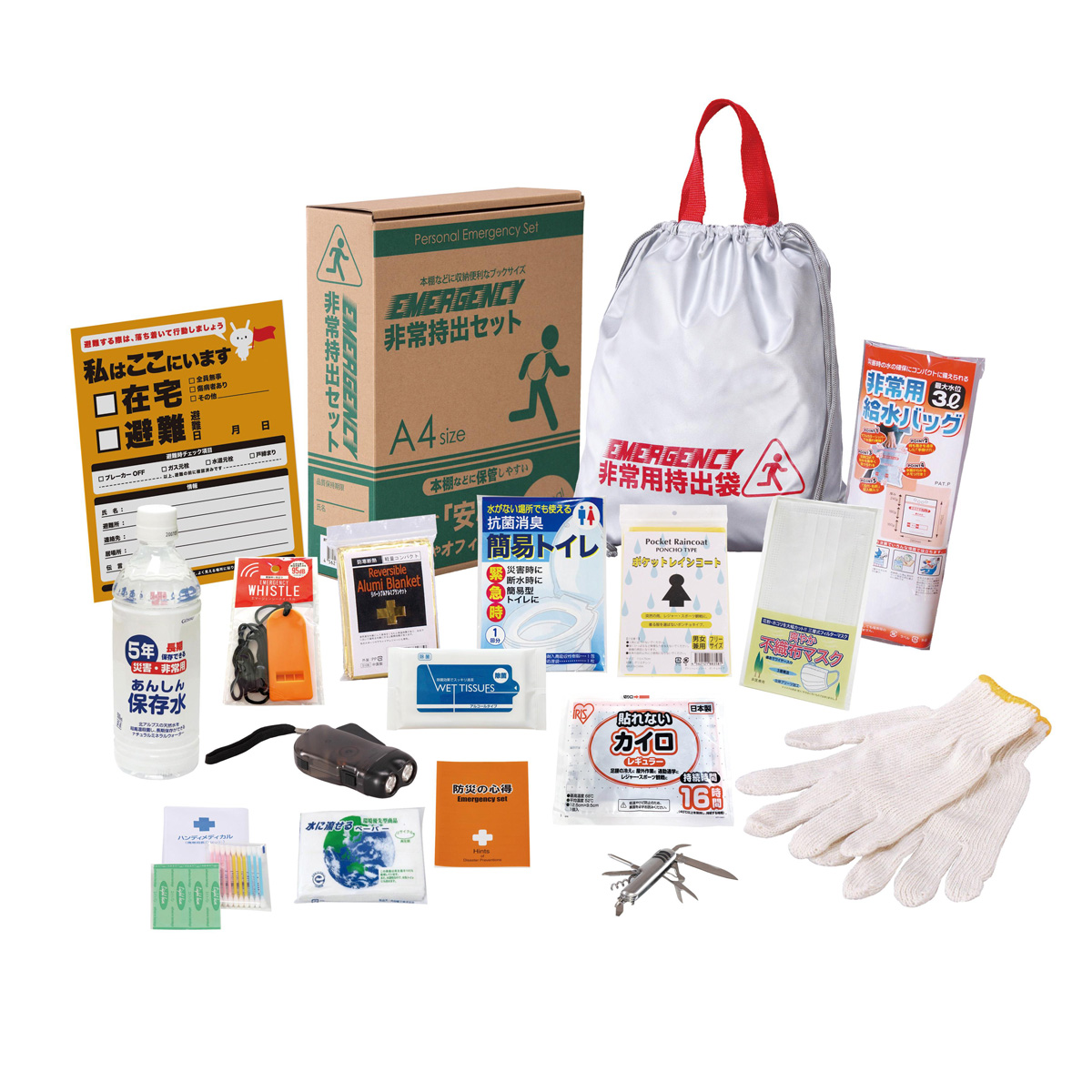 備考:非常持出袋・防災の心得・ホイッスル・カイロ・レインコート・抗菌消臭トイレ・ダイナモLEDライト・軍手・アルミブランケット・マスク・除菌アルコールウェットティッシュ・、5年保存水500ml・8徳ナイフ・給水袋3L・緊急避難カード・水に流せるペーパー・綿棒&バンソウコウ
