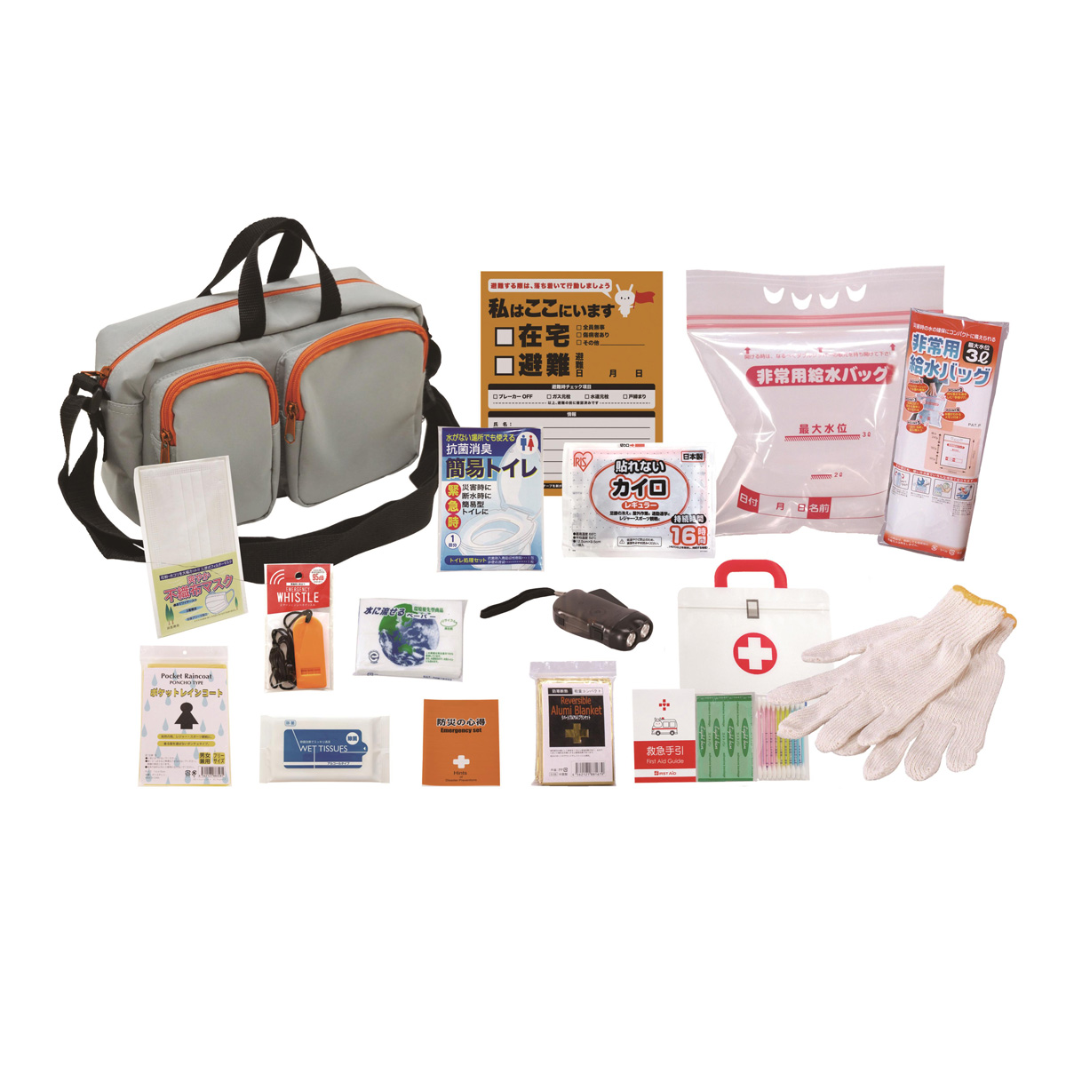備考:収納ショルダーバッグ・防災の心得・ホイッスル・カイロ・レインコート・抗菌消臭簡易トイレ1P・ダイナモLEDライト・アルミブランケット・マスク・給水袋3L・緊急避難カード・除菌アルコールウェットティッシュ・水に流せるペーパー・救急4点セット・軍手