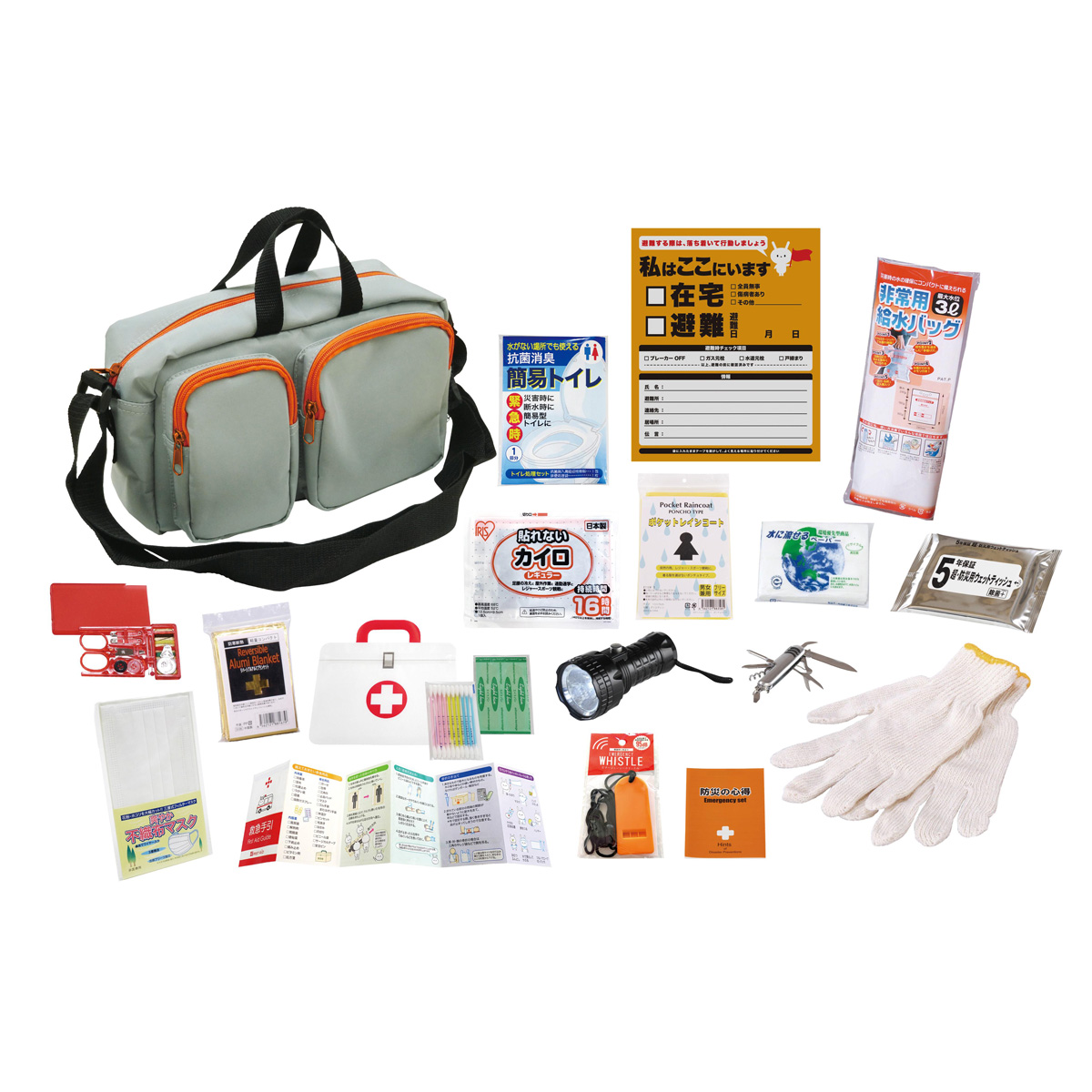 備考:収納ショルダーバッグ・防災の心得・ホイッスル・カイロ・レインコート・抗菌消臭簡易トイレ1P・軍手・アルミブランケット・マスク・ウェットティッシュ・給水袋3L・緊急避難カード・救急4点セット・水に流せるペーパー・懐中電灯・ソーイングセット・8徳ナイフ