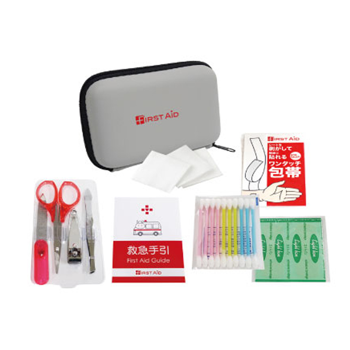 備考:収納ケース・絆創膏5P・綿棒10P・ワンタッチ包帯・コットンパフ3P・爪切り・爪やすり・毛抜き・はさみ・救急手引