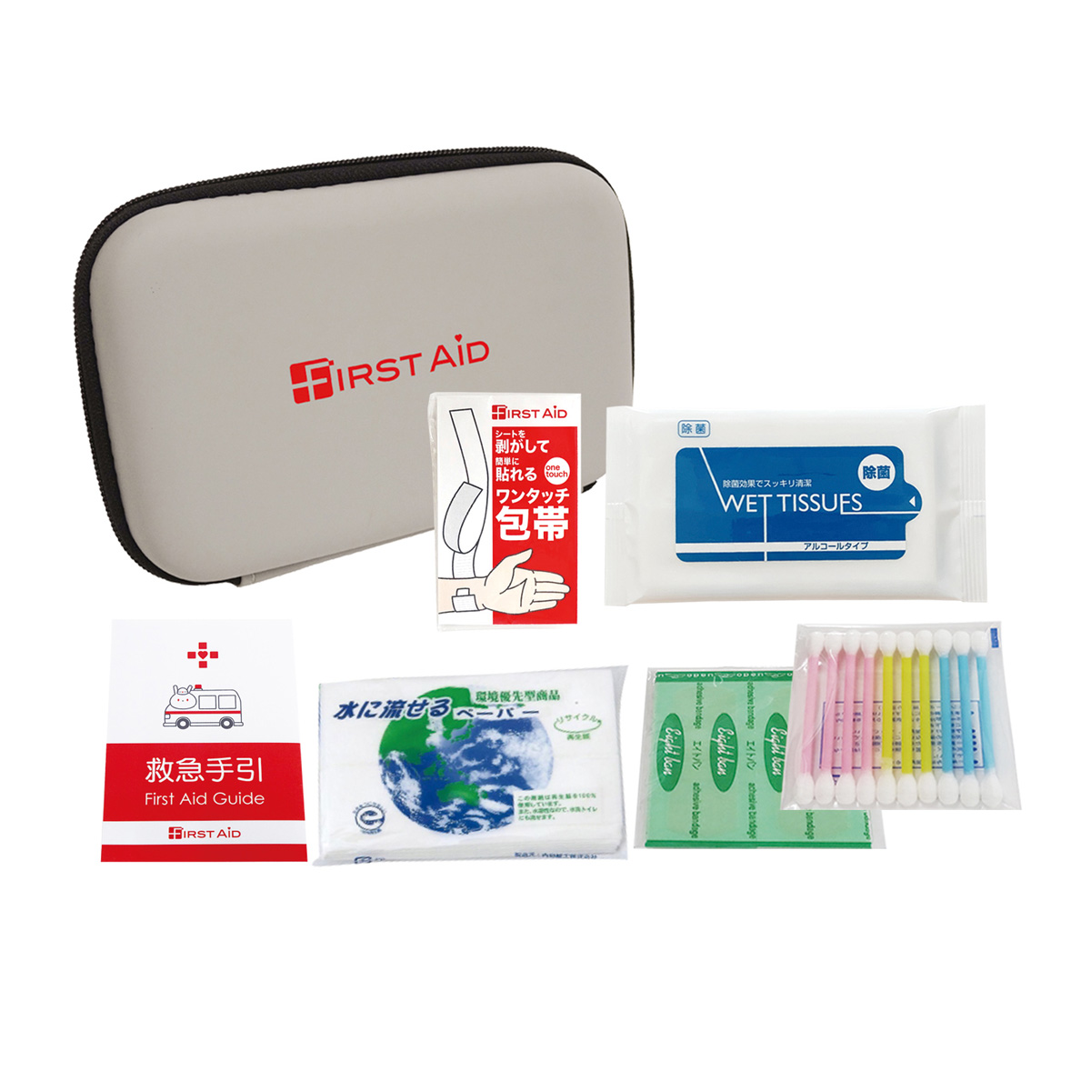 備考:収納ケース・絆創膏5P・ワンタッチ包帯・綿棒10P・水に流せるペーパー・除菌アルコールウェットティッシュ・救急手引