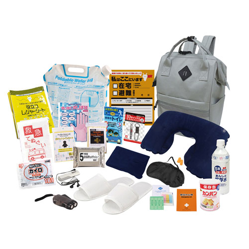 セット内容:収納リュック・IDホイッスル&カラビナリング・ウェットティッシュ・アルミブランケット・防災の心得・ダイナモマルチライト・綿棒&バンソウコウ・5年保存水500ml・カンパン・カイロ・レインコート・携帯用トイレ・FMラジオ・ネックピロー・アイマスク・耳栓・救急てぬぐい・スリッパ・レジャーシート・給水バッグ6.5L・緊急避難カード・ポリ手袋