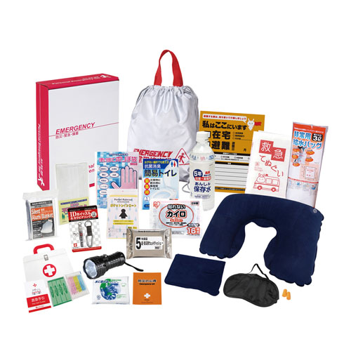セット内容:非常持出袋・IDホイッスル&カラビナリング・ウェットティッシュ・マスク・静音アルミブランケット・懐中電灯・5年保存水500ml・給水袋3L・カイロ・レインコート・抗菌消臭簡易トイレ・ネックピロー・アイマスク・耳栓・救急てぬぐい・緊急避難カード・水に流せるペーパー・救急4点セット・ポリ手袋・防災の心得