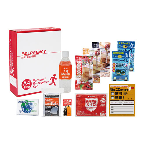 セット内容:バランススティック×3・7年保存水500ml・携帯用トイレ1P×2・静音アルミブランケット・水に流せるペーパー・カイロ・緊急避難カード・ホイッスル