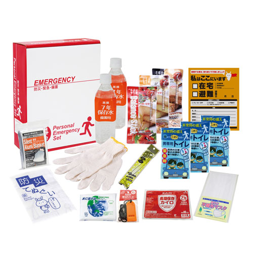 セット内容:バランススティック×3・7年保存水500ml×2・携帯用トイレ1P×3・静音アルミブランケット・水に流せるペーパー・軍手・発光スティック・カイロ・ホイッスル・マスク・緊急避難カード・防災てぬぐい