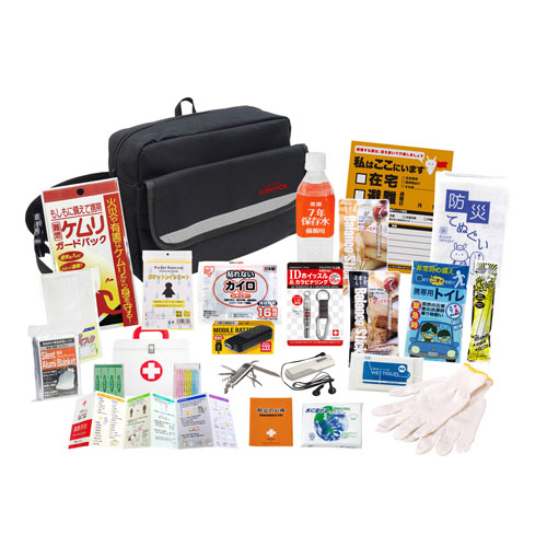 セット内容:収納バッグ・防災の心得・IDホイッスル&カラビナリング・カイロ・レインコート・携帯用トイレ1P・ケムリガードパック・発光スティック・モバイルバッテリー(乾電池式)・FMラジオ・軍手・静音アルミブランケット・防災てぬぐい・マスク・7年保存水500ml・バランススティック×2・8徳ナイフ・緊急避難カード・除菌アルコールウェットティッシュ・水に流せるペーパー・救急4点セット