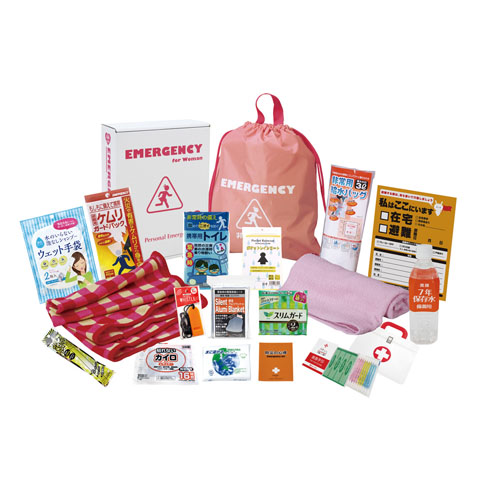セット内容:非常用持出袋・防災の心得・ホイッスル・カイロ・レインコート・携帯用トイレ1P・生理用ナプキン(8枚入)・静音アルミブランケット・フリースブランケット・フェイスタオル・ケムリガードパック・7年保存水500ml・給水袋3L・水に流せるペーパー・ウェット手袋・緊急避難カード・救急4点セット・発光スティック
