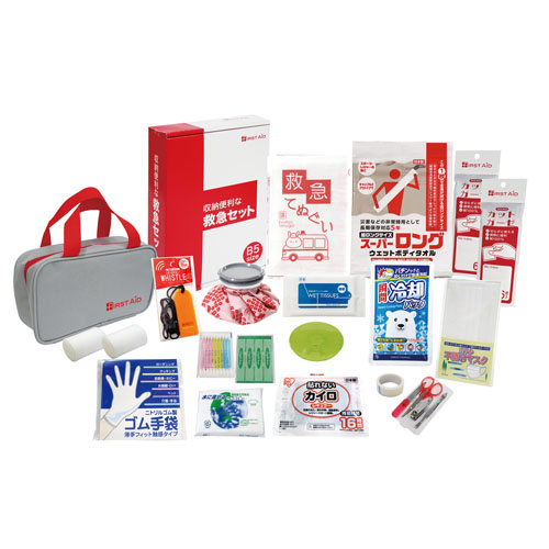 セット内容:収納ポーチ・伸縮包帯×2・カイロ・救急てぬぐい・カットガーゼ×2・除菌アルコールウェットティッシュ・マスク・ホイッスル・瞬間冷却パック・救急テープ・綿棒10P・絆創膏5P・水に流せるペーパー・ゴム手袋・ひょうのう・爪切り・はさみ・毛抜き・爪やすり・ボディタオル・ピルケース