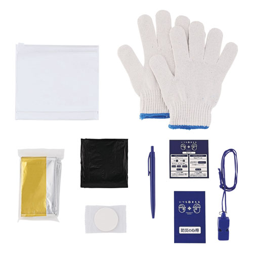 セット内容:軍手、ゴミ袋(3枚)、防災の心得帳、ボールペン、アルミブランケット、ホイッスル、メモ帳、圧縮タオル、ポーチ