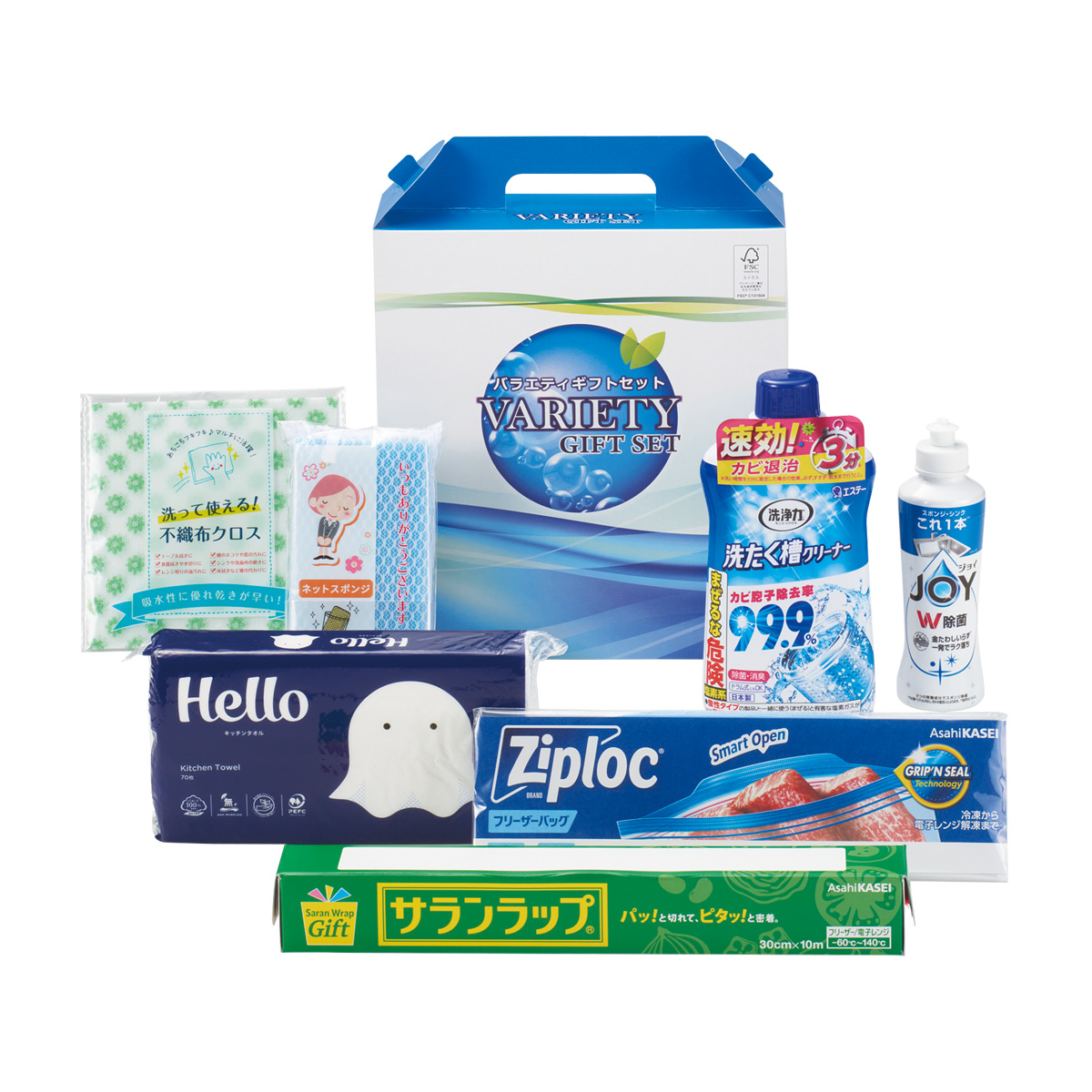 備考:セット内容/ネットスポンジ・ジップロックフリーザーバッグLM各1枚・サランラップ30㎝×10m・洗って使える!不織布クロス1枚・エステー洗濯槽クリーナー550ml・ジョイコンパクト170ml・ハローキッチンペーパー70枚