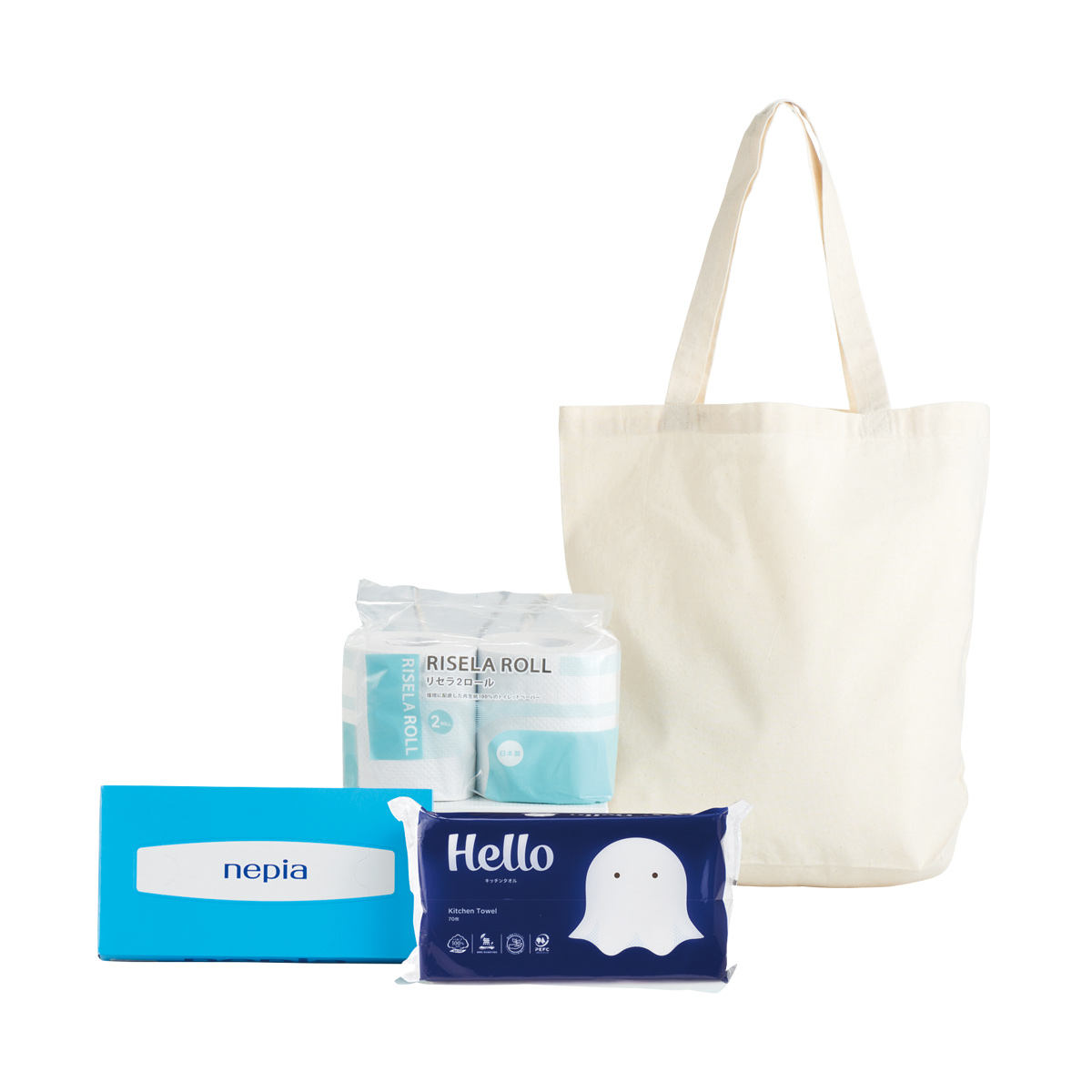 備考:セット内容/コットントートバッグ・リセラトイレット2ロール・ネピアBOXティッシュ150W・ハローキッチンペーパー70枚入