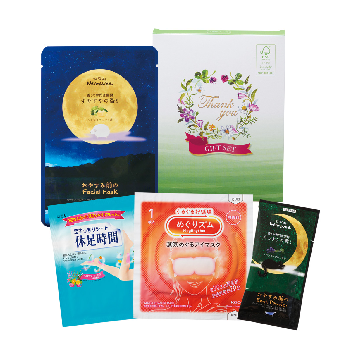 備考:セット内容/ライオン休足時間2枚入・花王めぐりズム(無香料)・入浴料バスパウダー(ぐっすりの香り)・フェイシャルマスク(すやすやの香り)