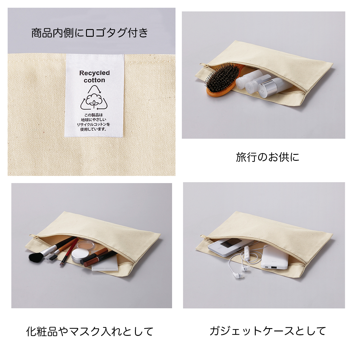 地球にやさしいリサイクルコットンを使用。ナチュラルで使いやすいフラットポーチです。