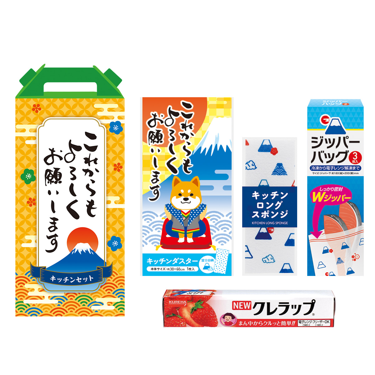 備考:NEWクレラップ22cm×10m・キッチンロングスポンジ・ジッパーバッグ(3枚入)・キッチンダスター(1枚入) 各1 食品検査済(クレラップ・ジッパーバッグ)