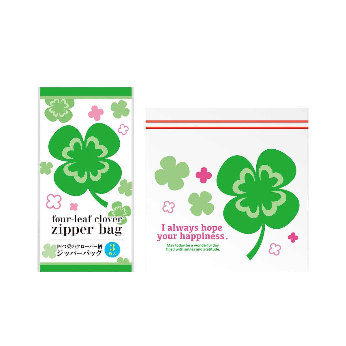 四つ葉デザインのジッパーバッグはWジッパー仕様で汁モレも安心。
