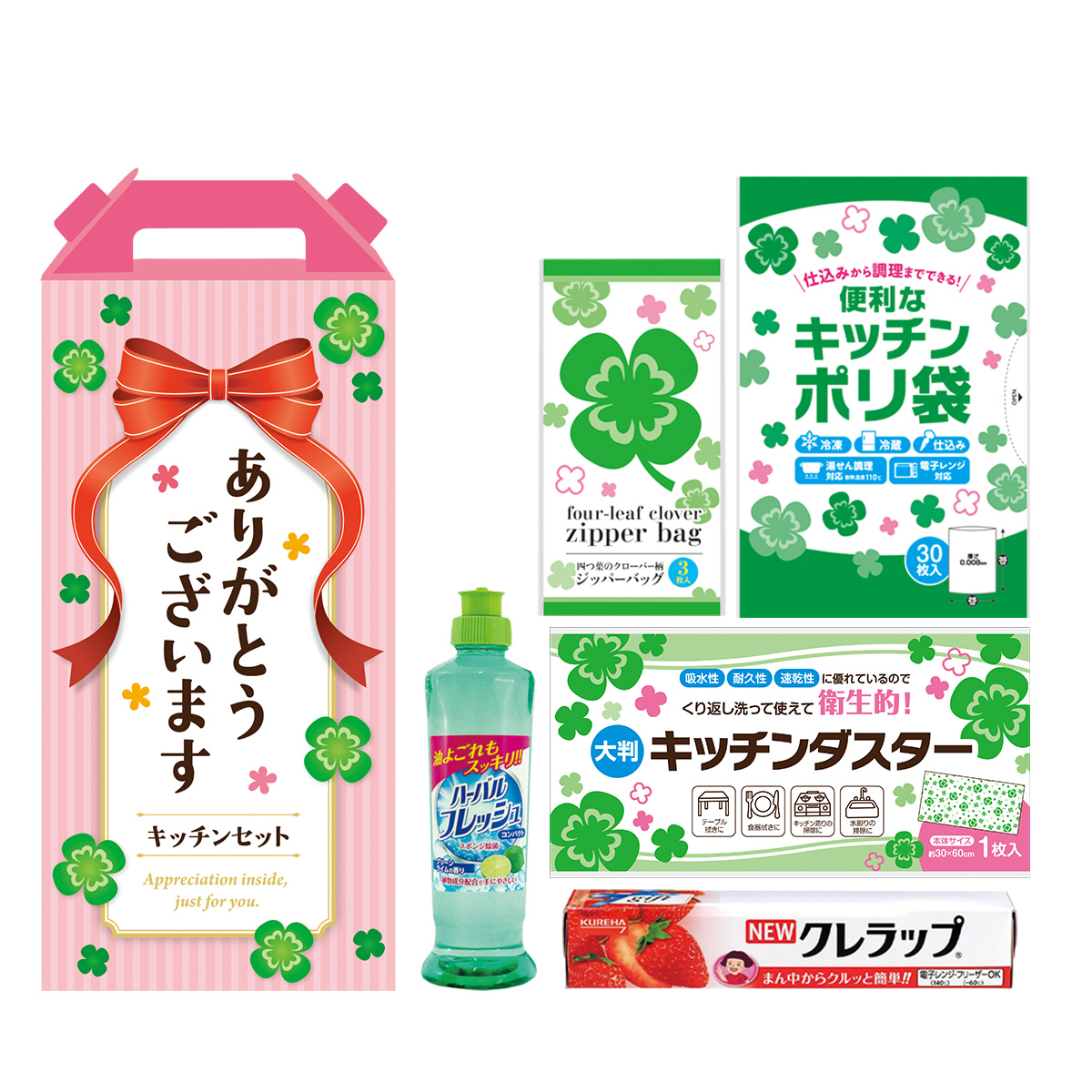 備考:NEWクレラップ22cm×10m・ハーバルフレッシュコンパクト(グリーンライム)250ml・ジッパーバッグ(3枚入)・キッチンダスター(1枚入)・キッチンポリ袋(30枚入) 各1 食品検査済(NEWクレラップ・ジッパーバッグ・キッチンポリ袋) 耐熱温度/110℃(キッチンポリ袋)