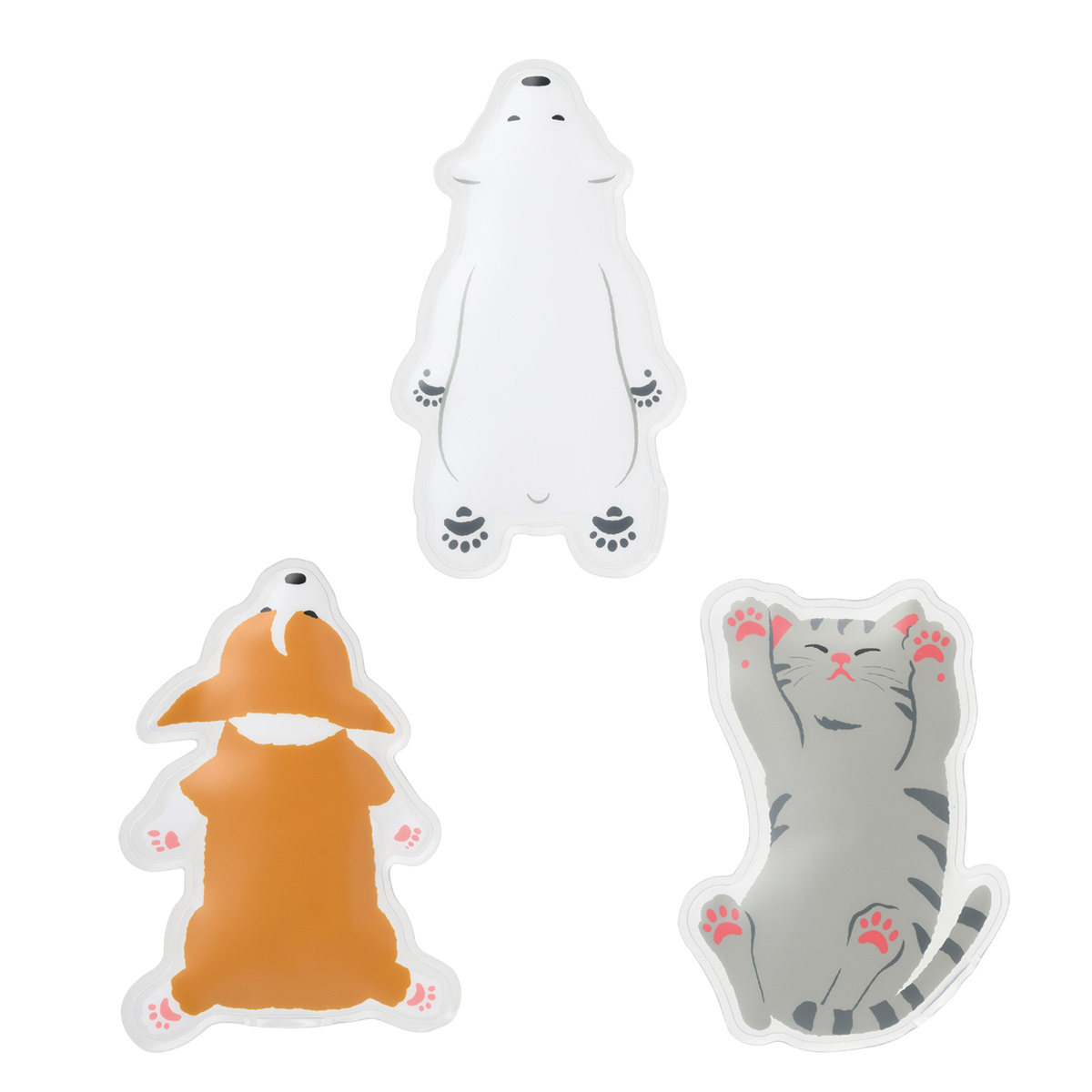 のんびり寝ているアニマルたちのデザインがポイントで、しろくま・いぬ・ねこの3種アソートになっています。