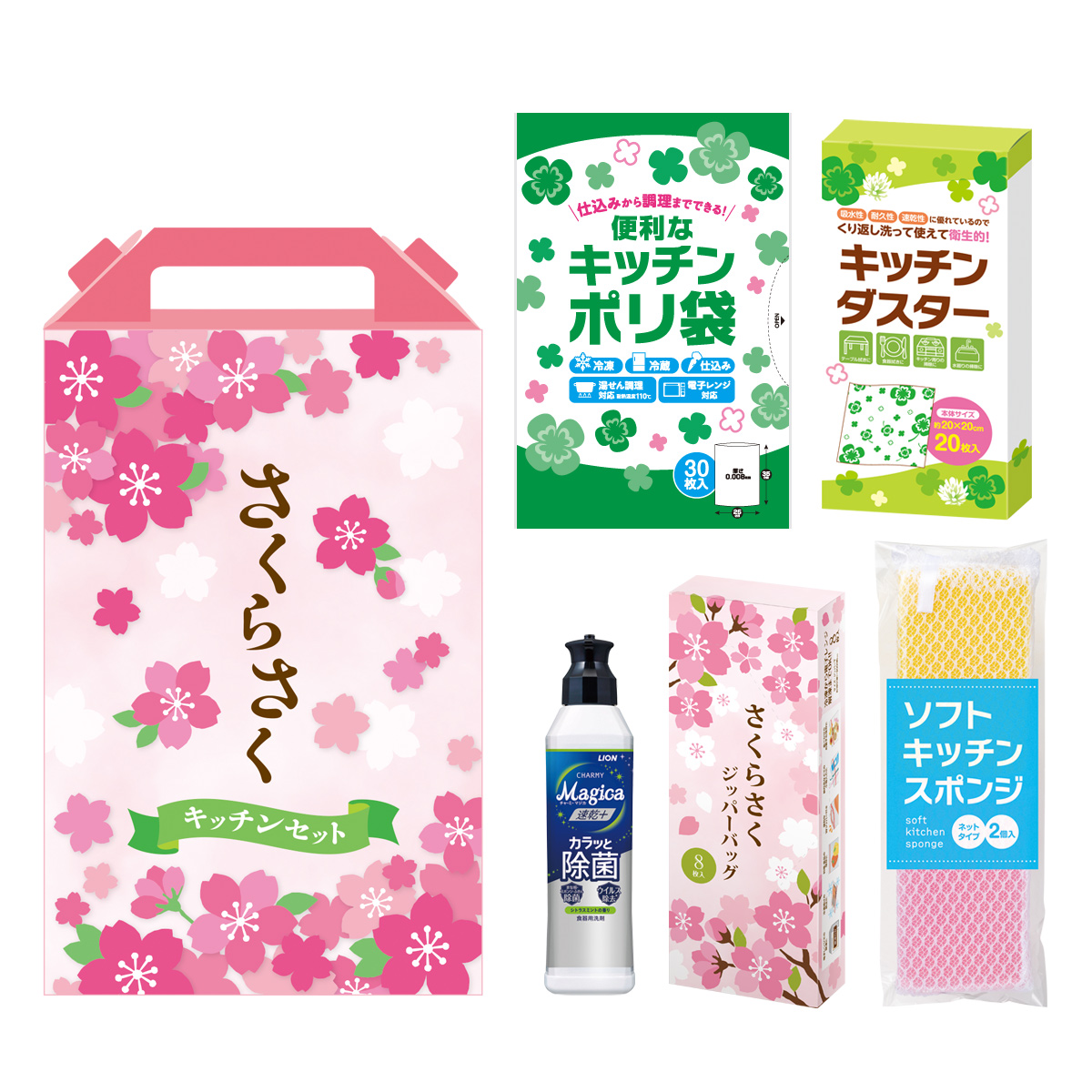 備考:内容:ライオン CHARMY Magica(速乾+カラッと除菌 シトラスミントの香り) 220ml・ソフトキッチンスポンジ(2個入)・ジッパーバッグ(8枚入)・キッチンダスター(20枚入)・キッチンポリ袋(30枚入) 各1食品検査済(ジッパーバッグ・キッチンポリ袋)・[耐熱温度]110℃(キッチンポリ袋)