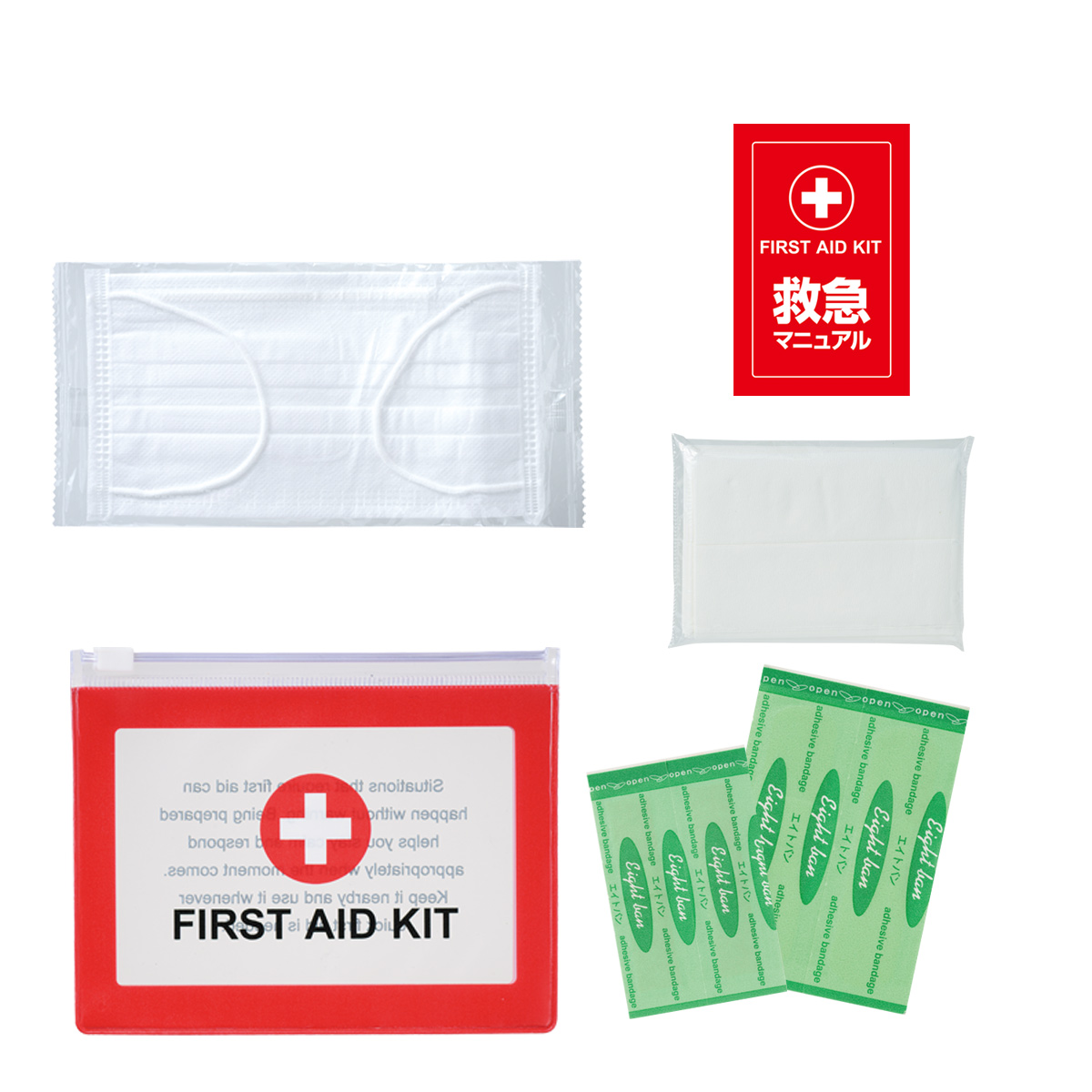 セット内容は、ポーチ、応急処置の方法が書かれたマニュアルカード、ばんそうこう(M×2・S×2)、マスク、ポケットティッシュ。