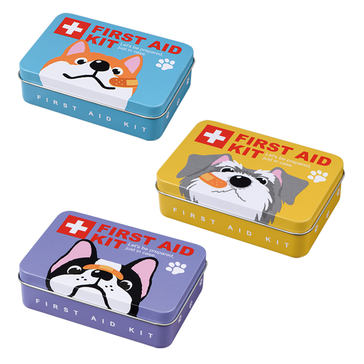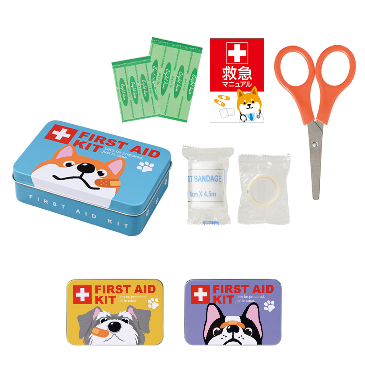 かわいい犬のデザインをあしらった小さな缶に、必要なアイテムをまとめた応急セット。
