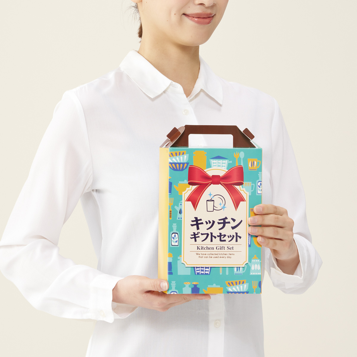 ギフトボックスは、さまざまなキッチンアイテムを鮮やかに描いた楽しいデザイン。