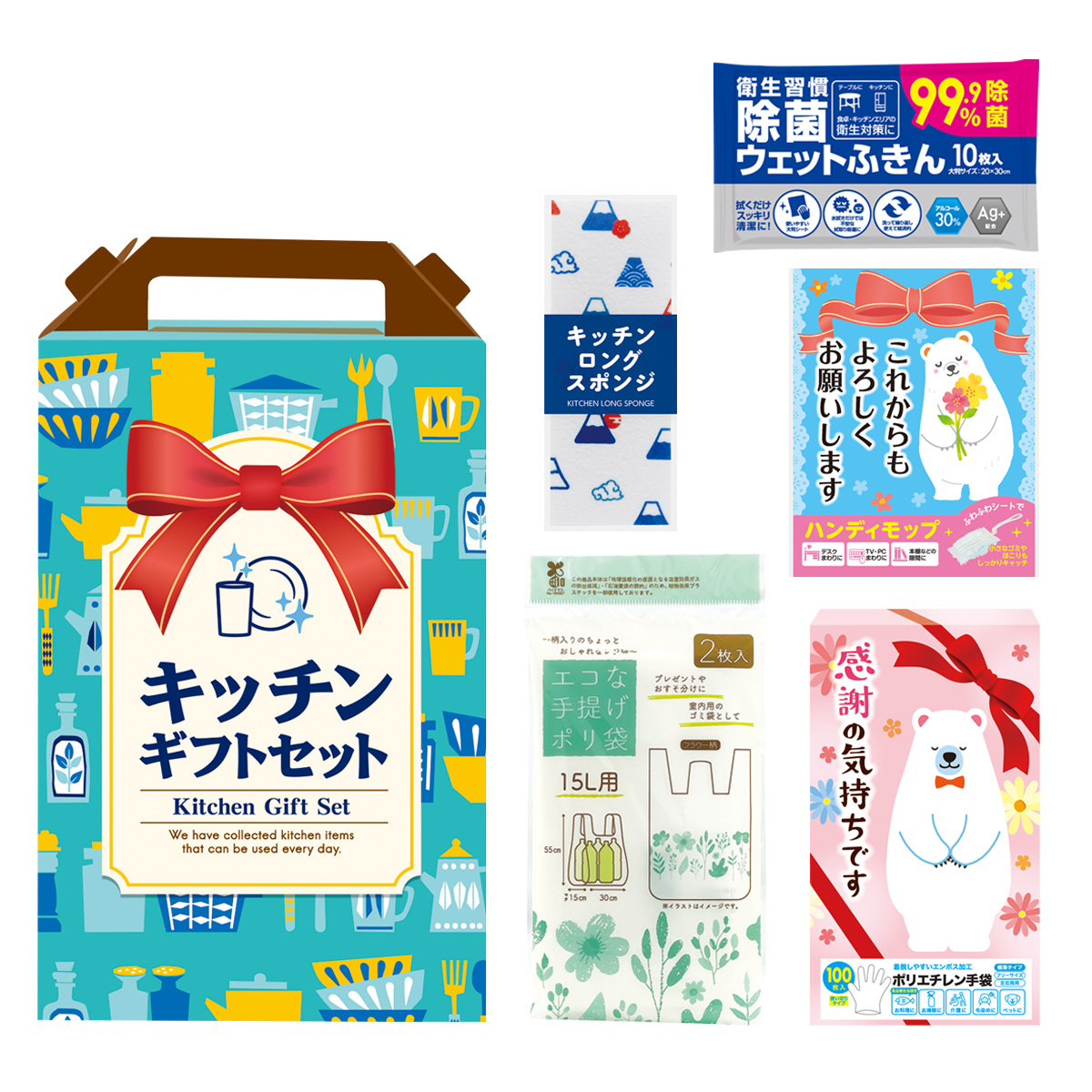 備考:内容:キッチンロングスポンジ・衛生習慣除菌ウェットふきん(10枚入)・ハンディモップ・ポリエチレン手袋(100枚入)・手提げポリ袋(2枚入) 各1 食品検査済(ポリエチレン手袋)