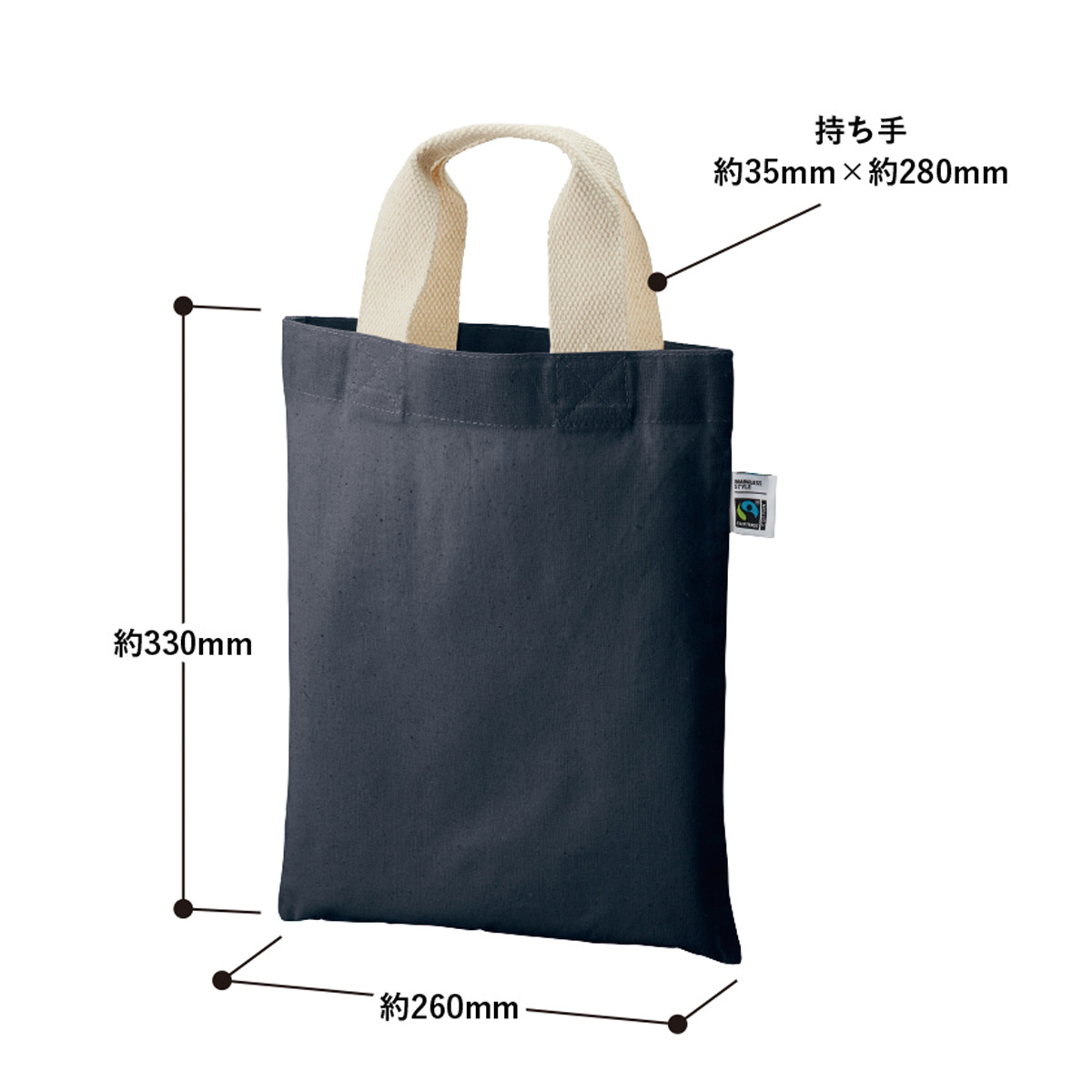 5オンスの薄手生地となっており、A4サイズの冊子がちょうど入る大きさです。
