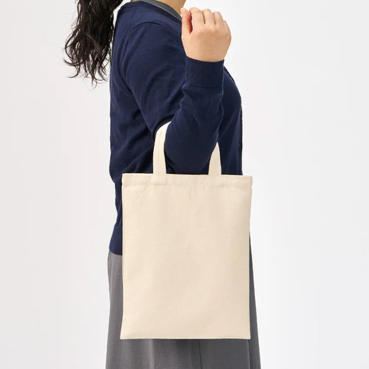 Sサイズ~LLサイズまでご用意しており、MサイズA4がしっかり入るサイズ感で手提げ袋として使いやすいハンドルの長さになります。