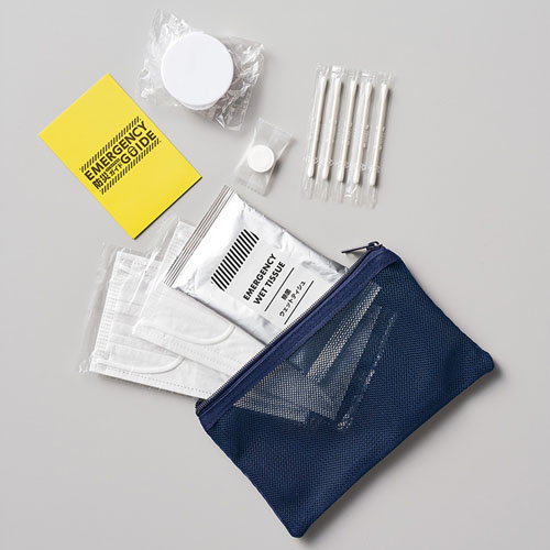 材質:ポーチ/ポリエステル ウェットティシュ/ポリエステル,レーヨン 綿棒/綿、紙 圧縮タオル/レーヨン マスク/不織布(PP) ピルケース/PP 防災ガイド/紙