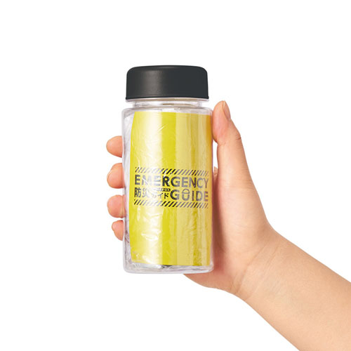 ボトル側面に黄色の防災ガイドやオレンジの薄型ホイッスルが見えるので